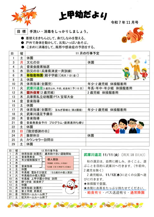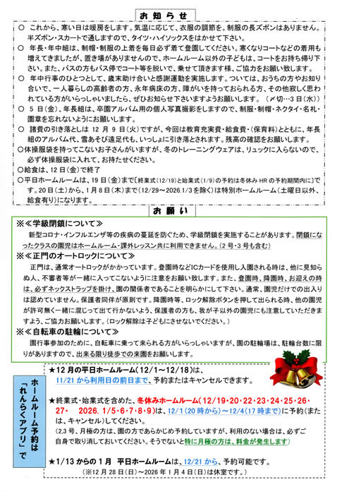 ・朝の登園時間は8時15分からです。それ以前の登園は、早朝預かり保育対象となりますので、前日までに必ずご予約下さい。