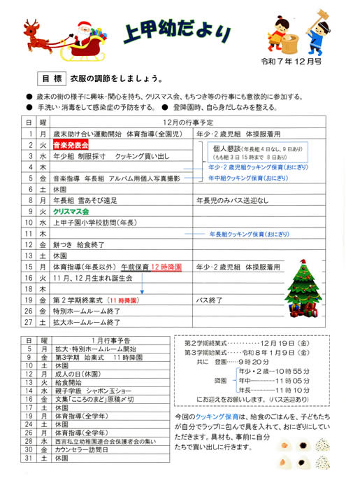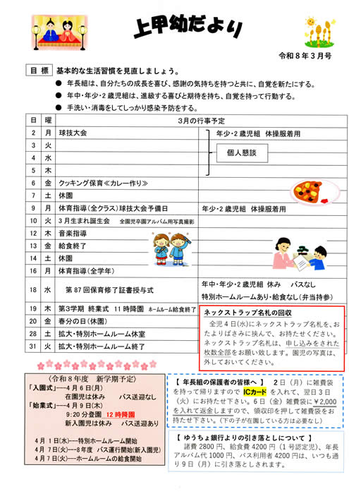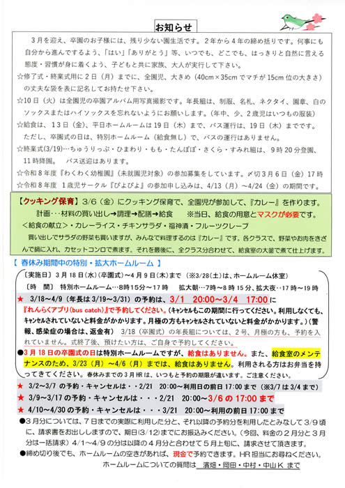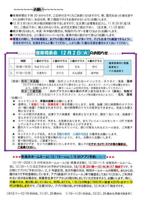 ・登園時間は9時20分までです。遅刻されます方は、給食数の決定がありますので、必ず事前にご連絡をください。9時20分から保育が始まります。