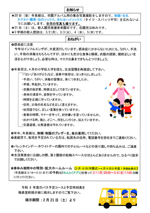 ・園の南側道路は、通学路となっています。朝7時から10時までの間は指定車両以外の通行は出来ません。園児の登降園時、走行車両が多く、安全面から交通取り締まりの強化をお願いしています。この時間帯は、園児の送迎におきましても、車での進入はされませんようにお願い致します。